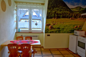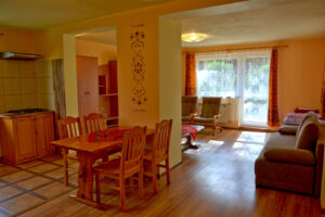 – apartament 5-cio osobowy o powierzchni 70 m2 z oddzielną sypialnią, kuchnią z pełnym wyposażeniem i łazienką, oraz tarasem